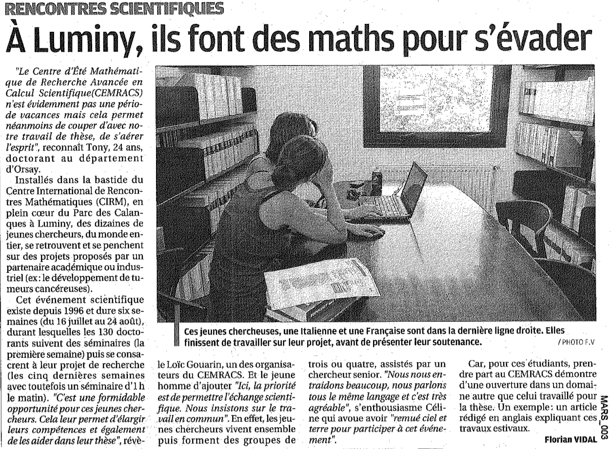 Le CEMRACS 2012 a fait l'objet de plusieurs communications médiatiques: